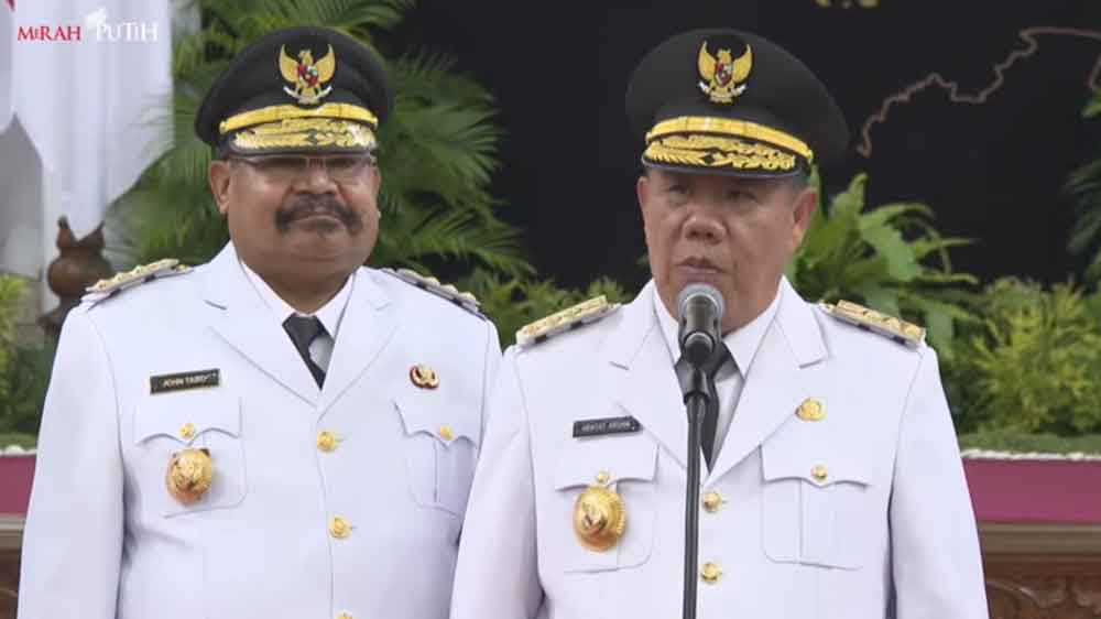 Gubernur Babel Hidayat Arsani bersama Gubernur Papua Pegunungan John Tabo saat jumpa pers usai dilantik Presiden Prabowo di Istana Negara, Kamis (17/4/2025)--(Tangkapan Layar/YouTube Sekretariat Presiden)