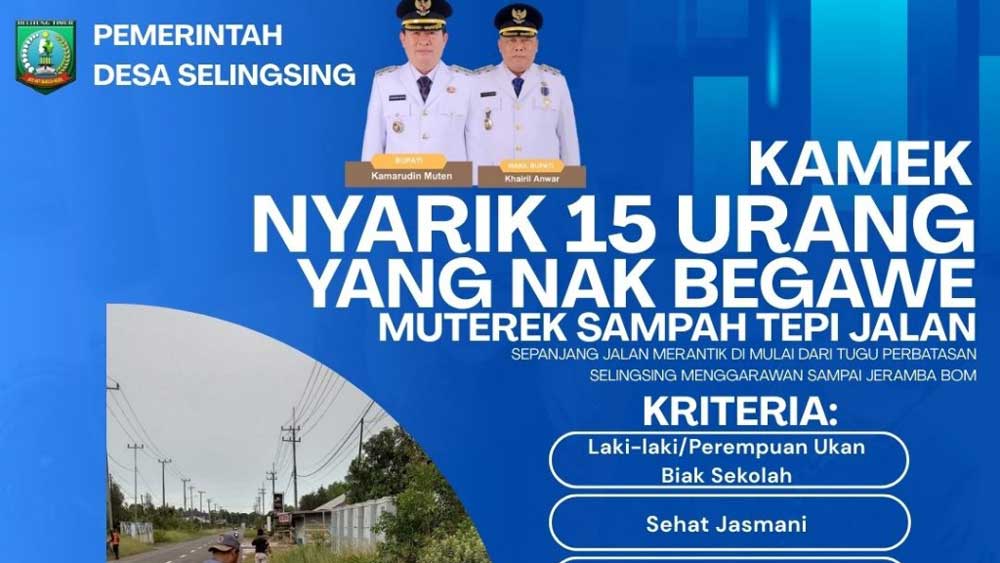 Lowongan dengan merekrut 15 orang tenaga kerja untuk kegiatan pembersihan sampah di sepanjang jalan Merantik, mulai dari tugu perbatasan Selingsing–Manggarawan hingga Jeramba Bom.