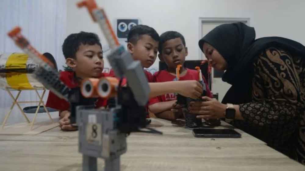 Seorang guru mendampingi siswa saat merakit komponen robot di Lembaga Kursus dan Pelatihan (LKP) Autobot School, Klaten, Jawa Tengah, Kamis (27/3/2025)-Aloysius Jarot Nugroho/nz-ANTARA FOTO