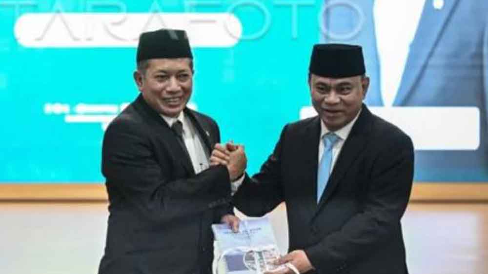 Menteri Koperasi Ferry Juliantono (kiri) bersama menteri koperasi sebelumnya Budi Arie Setiadi (kanan) berjabat tangan saat acara serah terima jabatan di Kantor Kementerian Koperasi, Jakarta, Selasa (9/9/2025)-Fauzan/foc-ANTARA FOTO